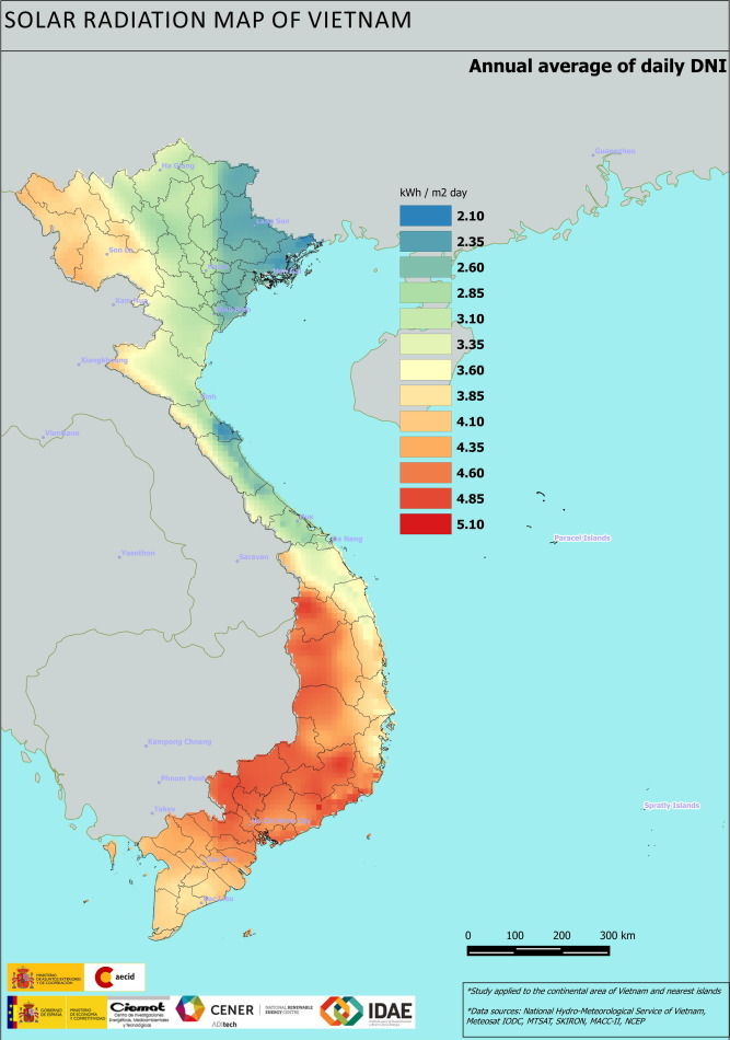 Số liệu trên website PVGIS thuộc Ủy ban châu Âu cho thấy Việt Nam có chỉ số bức xạ mặt trời trung bình đạt 3,5 kWh/m2/ngày, phù hợp lắp đặt điện mặt trời. Bên cạnh đó, một bản đồ nhiệt khác từ Cục Năng lượng Tây Ban Nha (Bộ phận Năng lượng Tái tạo - CIEMAT) thực hiện phối hợp với Bộ Công Thương Việt Nam cũng được một số đơn vị lắp đặt áp dụng thời gian qua. Bản đồ này được xây dựng vào năm 2015.